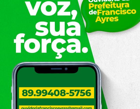 Prefeitura Municipal de Francisco Ayres dar a Públicidade a Criação Ouvidoria Municipal de Francisco Ayres Queremos ouvir você! Neste espaço o cidadão poderá fazer suas reclamações e sugestões, e ter um maior contato com a prefeitura. O que é Ouvidoria A Ouvidoria é uma unidade criada para que o(a) cidadão(ã) possa tirar dúvidas, enviar reclamações, denúncias, elogios e sugestçõs relativas à Administração da Prefeitura e demais órgãos correlatos. Nosso objetivo Tornar a Administração Pública Municipal de Francisco Ayres-PI mais próxima do(a) cidadão(ã), colaborando na excelência dos trabalhos desempenhados. segue abaixo o email + fone (wattszap) email:ouvidoriafranciscoayres@gmail.com fone (zap): 89 99408-5756